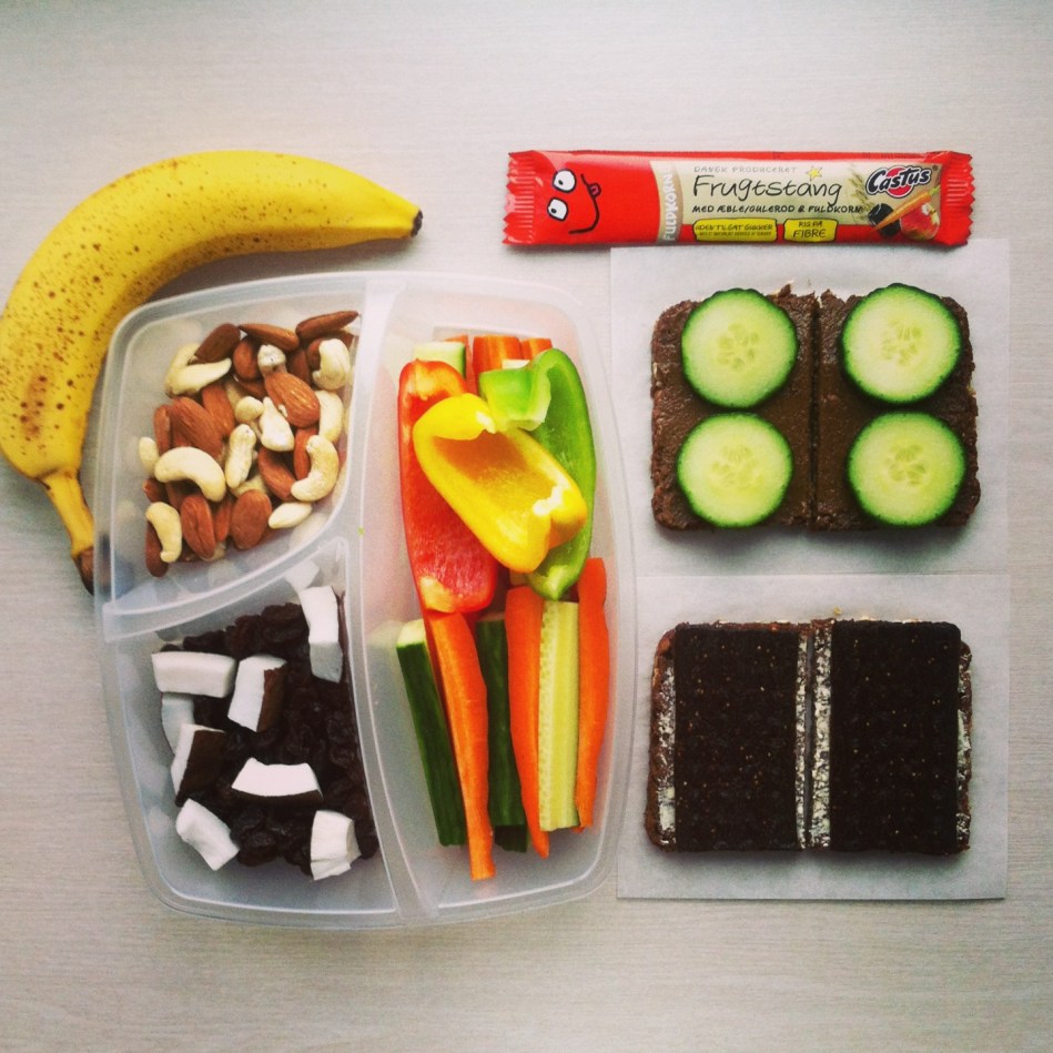 Den består af: Banan, frugtstang, mandler, cashewnødder, rosiner, frisk kokos, gulerodsstænger, agurkestænger, peberfrugt, rugbrød med tahin og agurk og rugbrød med figenpålæg.