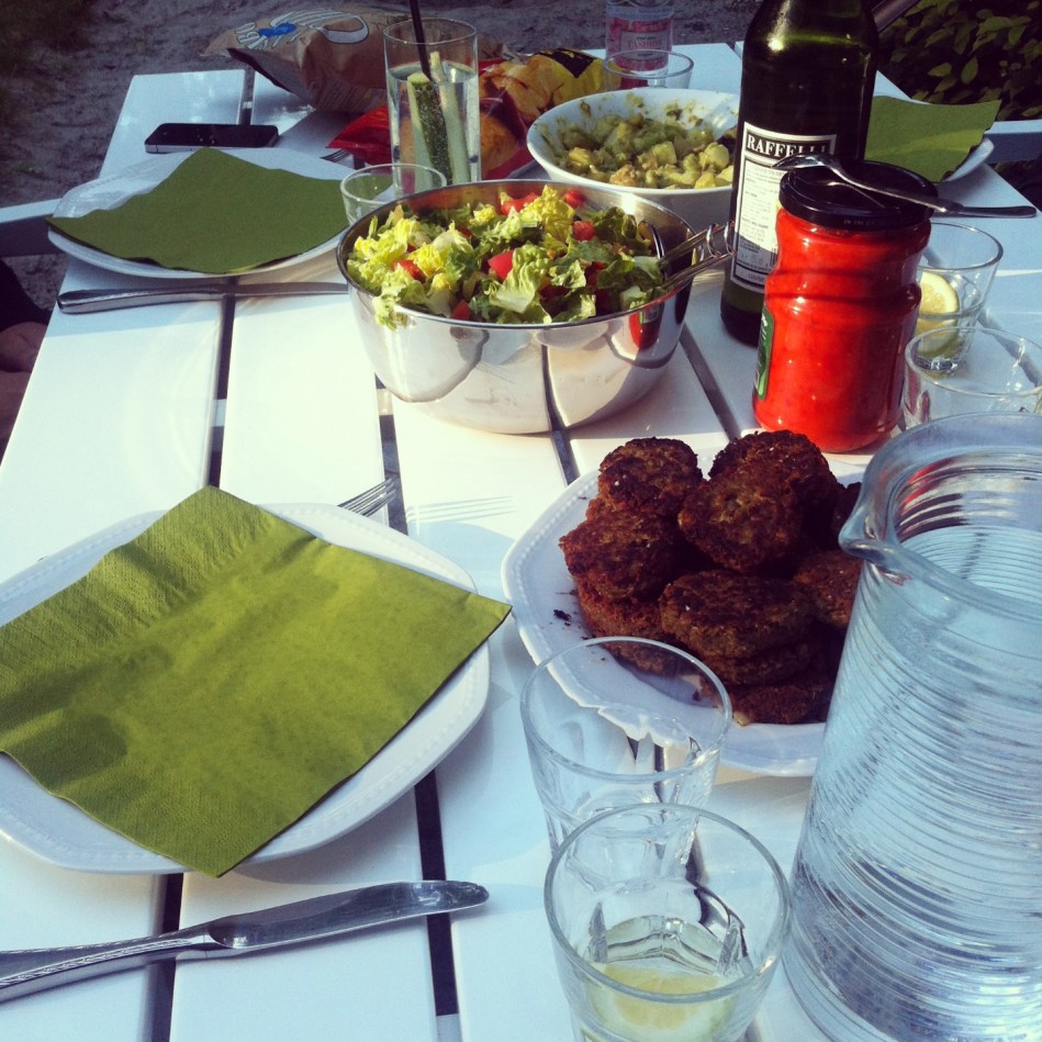 Det er rart at kunne spise ude. Her får vi linsebøffer, kartoffelsalat med avocado og en grøn salat. https://thomaserex.wordpress.com/2012/08/15/kartoffelsalat-med-avocado/