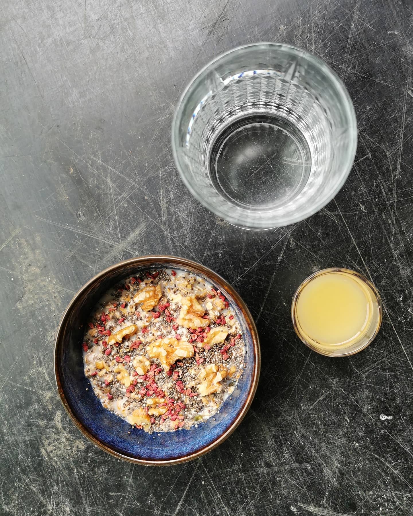 • 100 g havregryn/mysli med valnødder, chiafrø og havremælk (køb kun plantemælk tilsat calcium!)