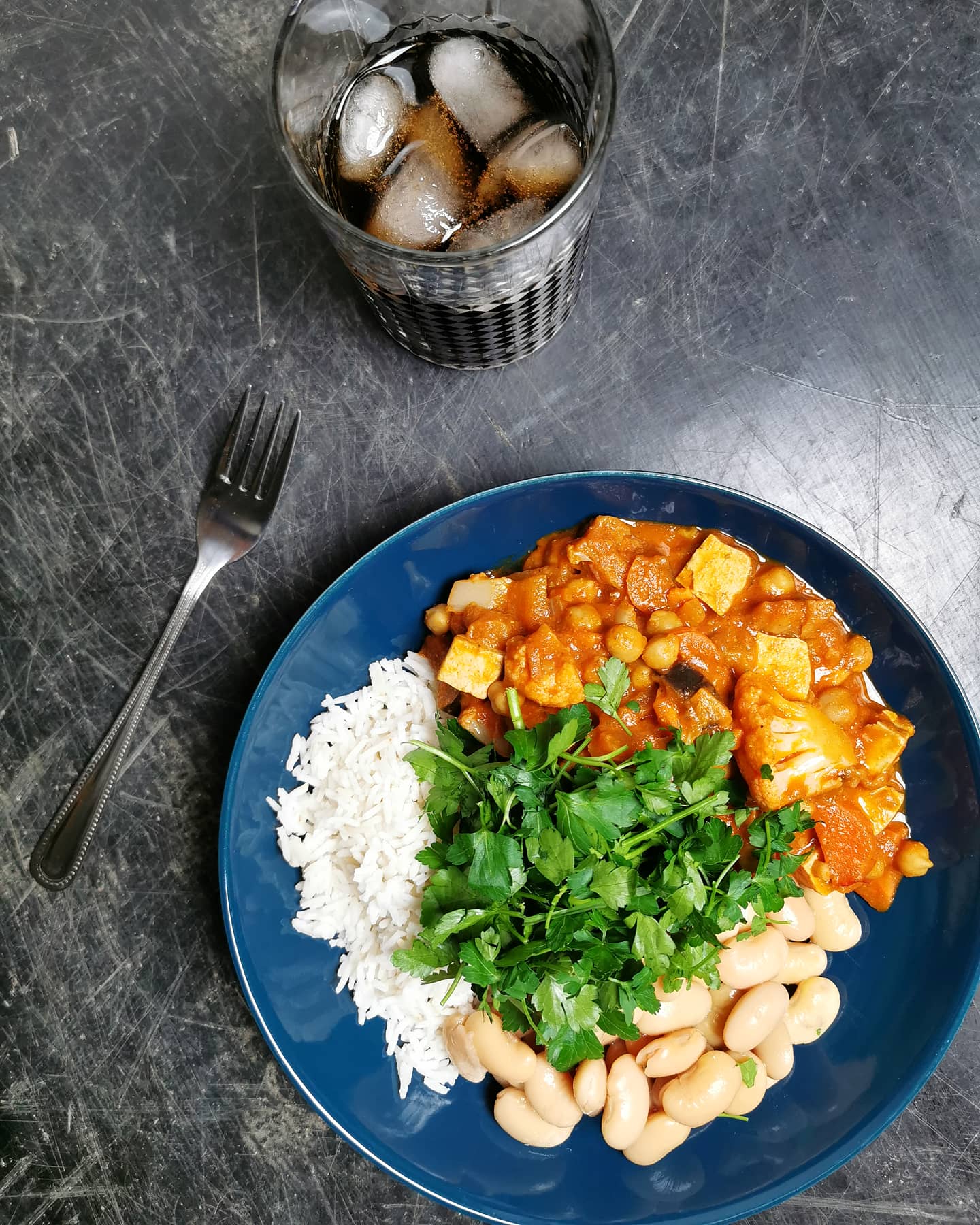 • 500 g karryret med kikærter, tofu, aubergine, sødkartoffel, gulerod, blomkål, løg, hvidløg, chili, ingefær, tomatpassata, kokosmælk, krydderier, olie og persille (i stil med denne opskrift)