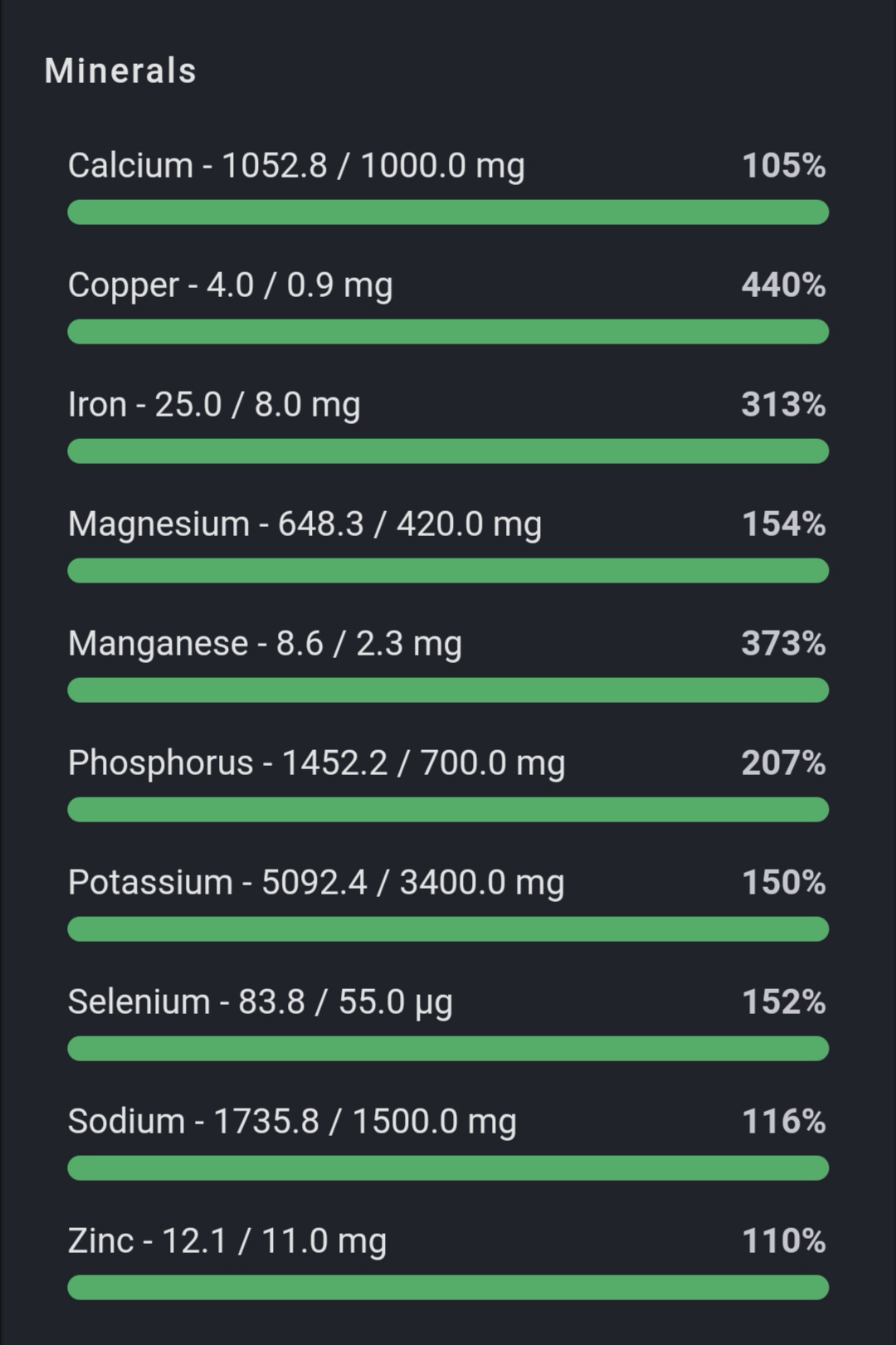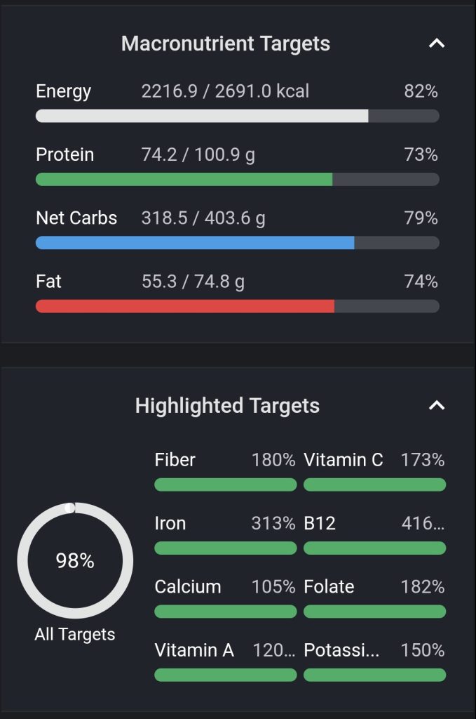 De anbefalede 600 g frugt og grønt er hjemme allerede inden aftensmaden, og jeg får masser af fibre, som danskerne ellers får for lidt af. 😇 Der er ret stor variation her, og det er slet ikke nødvendigt, hvis man vælger de rigtige fødevarer. Min blogger-kollega Mia Sommer har lavet et indlæg her med fokus på at nå sine næringsstoffer med lav variation i fødevarer. Mit fokus her er at vise jer en relativt normal dag for mig. Her får I et par billeder fra Cronometer af mit indtag denne dag.
