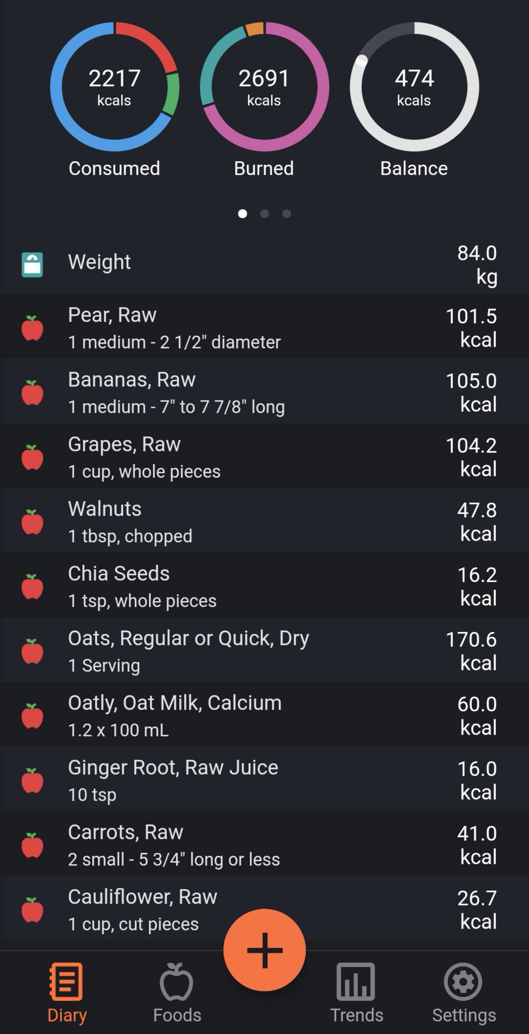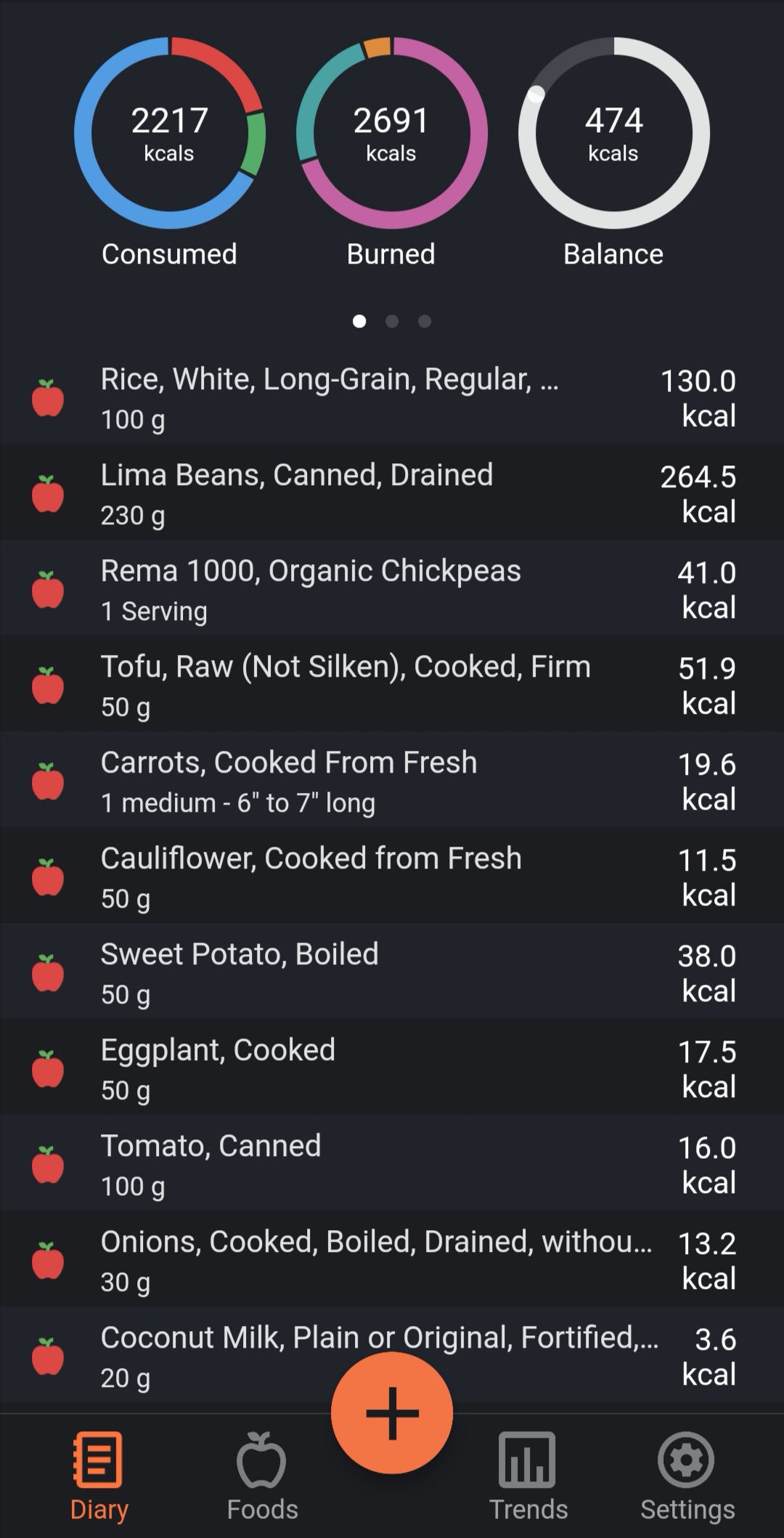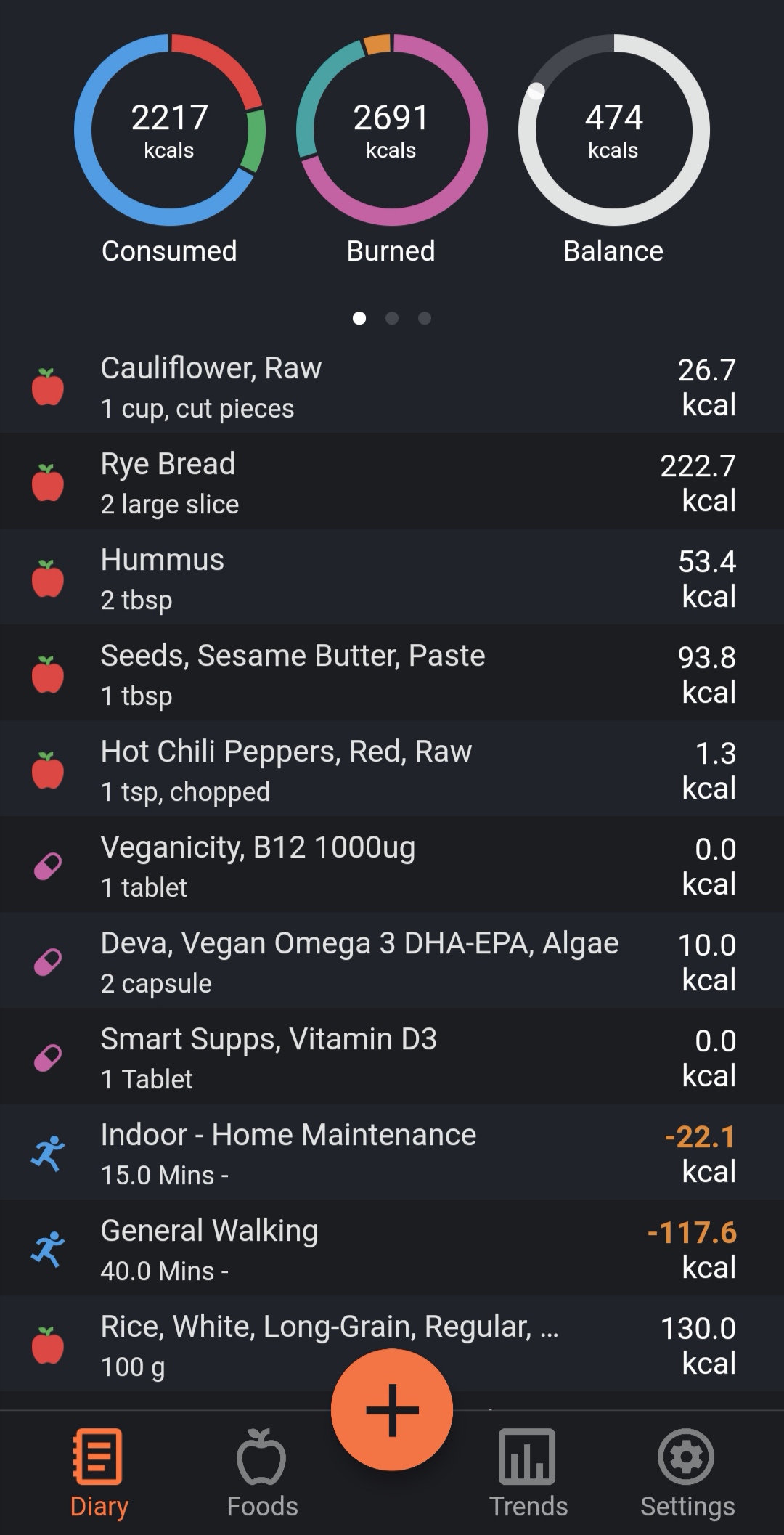 I det her eksempel på en dagskost er der lidt mere kulhydrat og lidt mindre af de andre to. Jeg ligger desuden 474 kcal i underskud, hvilket er perfekt, hvis jeg vil tabe mig lidt eller kompensere for andre dage, hvor jeg indtager for mange kcal. (Og dem er der et par stykker af!) Cronometer har udregnet mit BMR/basalstofskifte til 1885 kcal. Det vil sige, at hvis jeg slet ikke laver noget fysisk, forbrænder jeg 1885 kcal. Jeg har denne dag været meget stillesiddende på hjemme)arbejde, men jeg har også gjort lidt rent, lavet mad og gået tur med hunden. Cronometer mener, jeg har brug for 2691 kcal, og jeg indtager i alt 2216,9 kcal. Dermed er jeg som sagt 474 kcal i underskud… Puh, nu er der altså for mange tal til min humanist-hjerne! Her er et billede: