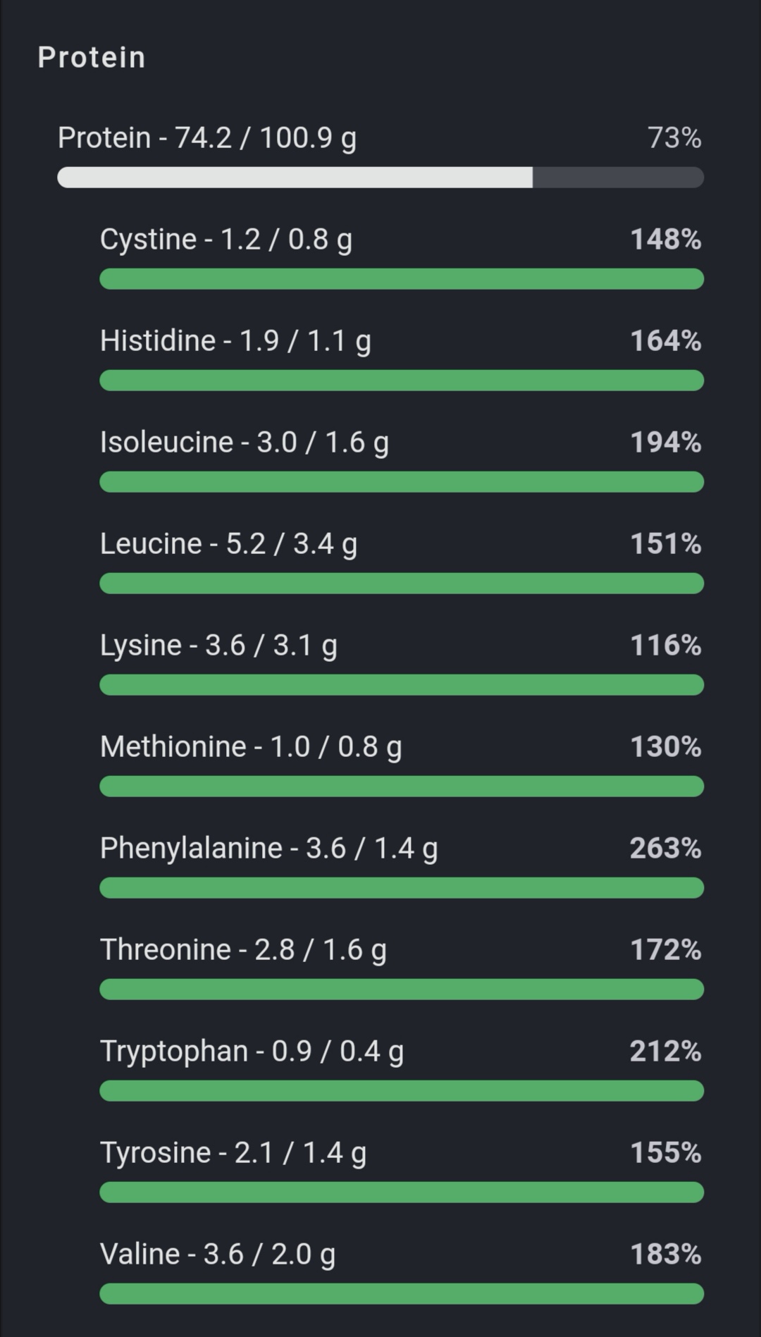 Nogle næringsstoffer kan drille mere end andre i den plantebaserede kost. Du kan med fordel være opmærksom på, om du får nok af fx calcium, selen, D-vitamin og B12. Jeg kan anbefale at læse bogen “Den Plantebaserede Kost” af klinisk diætist Maria Felding og læge Tobias Schmidt Hansen. Den giver en grundig indføring i alt, hvad du skal vide om at spise plantebaseret, hvis du gerne vil leve sundt. Her er hvad jeg fik af mikronæringsstoffer og aminosyrer denne dag.