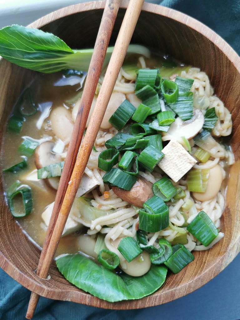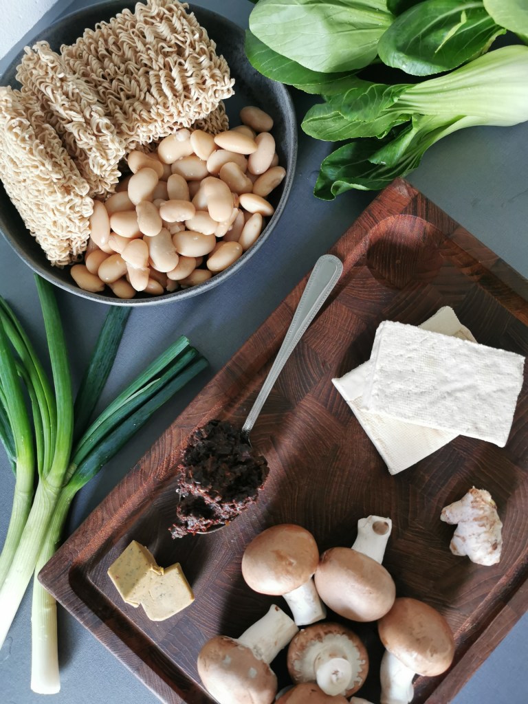 Tilsæt så bouillon, kogende vand, nudler, bønner og tofu. Lad det koge i cirka fem minutter. Skru ned.
