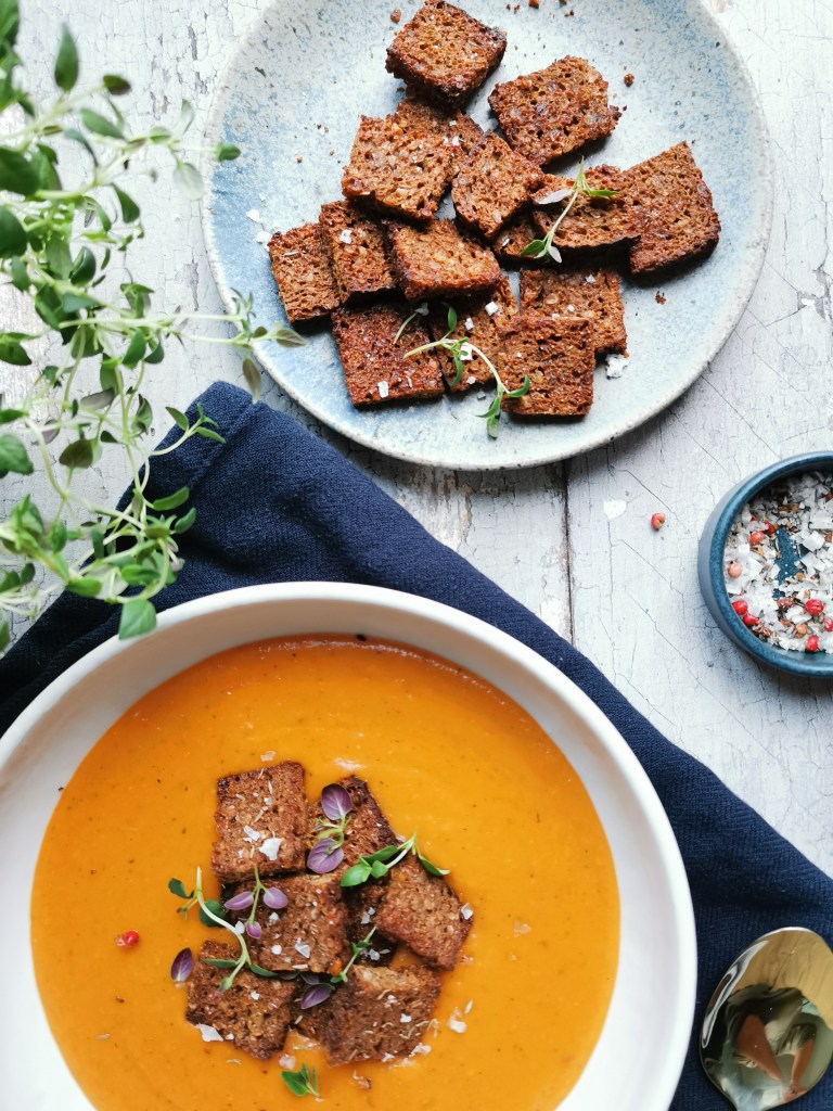Jeg pynter med plantebaseret fløde på toppen, drysser med lidt salt og rosmarin, og så serverer jeg gerne med lidt groft brød.