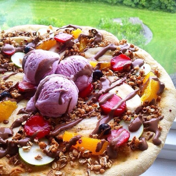 Start med en lave en pizzadej (eller brug en færdiglavet, de er veganske). Rul en klump dej ud til en tynd og rund(!) pizzabund. Bland peanutbutter med vand og agave til en medgørlig konsistens og smør et lag på bunden. Resten kan du dryppe over pizzaen – evt. med kakao blandet i. Bag så bunden i en meget varm ovn (skru hel op) på en bagesten eller en forvarmet bageplade. Når dejen er sprød og gylden, tager du den ud og lægger skiver af frugt, bær, mysli og is på. Slut af med chokoladesauce/smeltet chokolade. Server mens pizzaen og chokoladen stadig er varm og isen er kold. Nom, nom, nom!
