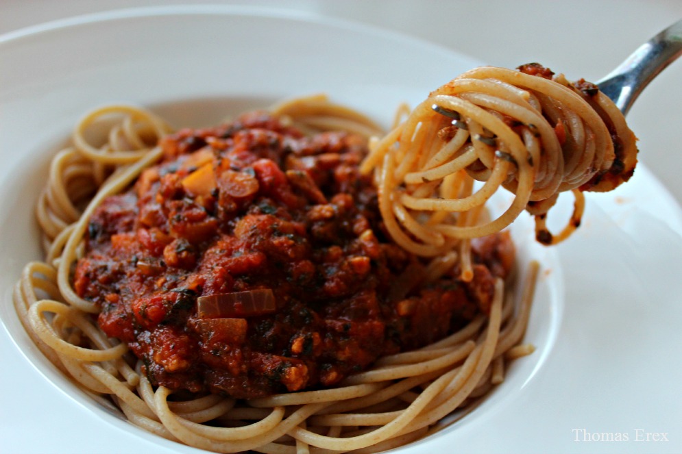 Den lækre ret “spaghetti bolognese” har masser af udtryk. I min tidlige barndom var den intenst salt og havde i sin essens kun to ingredienser: Kød og sovs. Det er den, der går under navnet “kød i mørke”, og som de fleste af os heldigvis har bevæget os væk fra. Det var også en tendens, der gav sig udtryk i den bolognese, jeg fik serveret derhjemme op gennem min barn- og ungdom. Løget havde altid været en velkommen del af retten, selv i dens allermørkeste time, men lige så stille sneg der sig flere og flere grønsager ind. Den første farveklat kom fra en klart orange rod, der i forvejen havde sneget sig ind i kødkøkkenet som koge-kammerat med kartoflen: Guleroden. Så kom dåsetomaten til og gjorde saucen til en lidt mindre tung tungeslasker. De næste grønne krigere, der kæmpede sig vej ind i mørket var porren og dåsemajsen, og langsomt blev der åbnet op for en hel hær af grønne udfordringer til det ellers så farvesky aftensmåltid. Peberfrugter, babymajs, ærter, oliven, chili, krydderurter… Nu har den grønne hær vundet slaget om bolognesen og magten over territoriet er fuldt overtaget. Jeg døber dig: Spaghetti veganese!