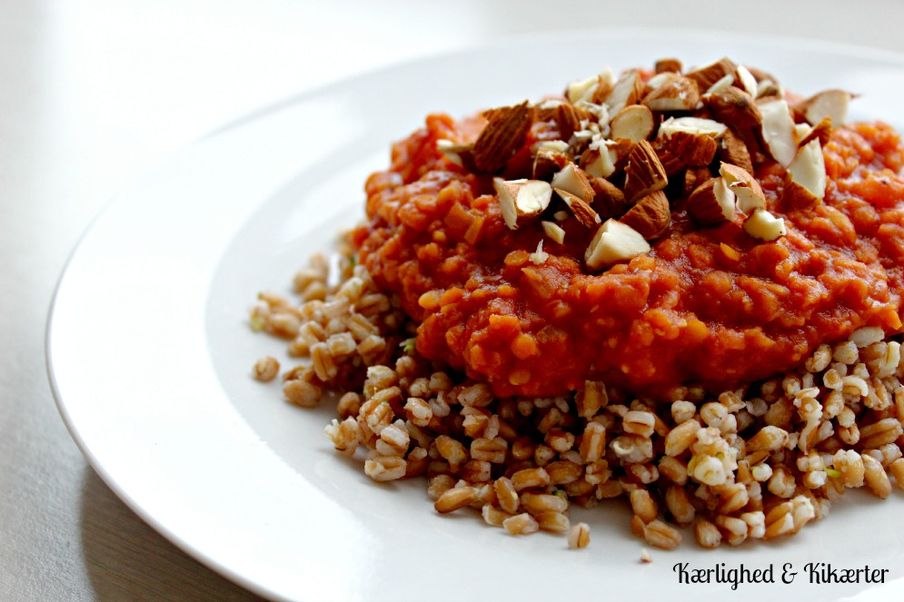 Sauter rødløg, hvidløg, ingefær og chili sammen med spidskommen i lidt olie i en gryde. Når løgene er klare, og der dufter godt af ingefær, hvidløg og spidskommen, så tilsæt gulerødder og peberfrugt, og lad det sautere med et par minutter, indtil det er mørt. Tilsæt så linserne og en liter af bouillonen (den må gerne koge – du kan fx tilsætte bouillonpulver/-terning og så kogt vand fra din el-kedel). Lad det koge til linserne er møre – det vil sige kogt ud (cirka 20 minutter) – og tilsæt mere vand undervejs, hvis det er nødvendigt. Når dahlen er kogt færdig smager du til med peber, mere spidskommen og evt. salt. Tag den så fra varmen, og rør tomatpuréen i. Smag til en sidste gang, og server så din dahl med fx (brune) ris eller, som på billedet, med kogte speltkerner. Drys med hakkede nødder for at få lidt knas. Fx ristede eller røgede mandler, cashewnødder eller pistacienødder.