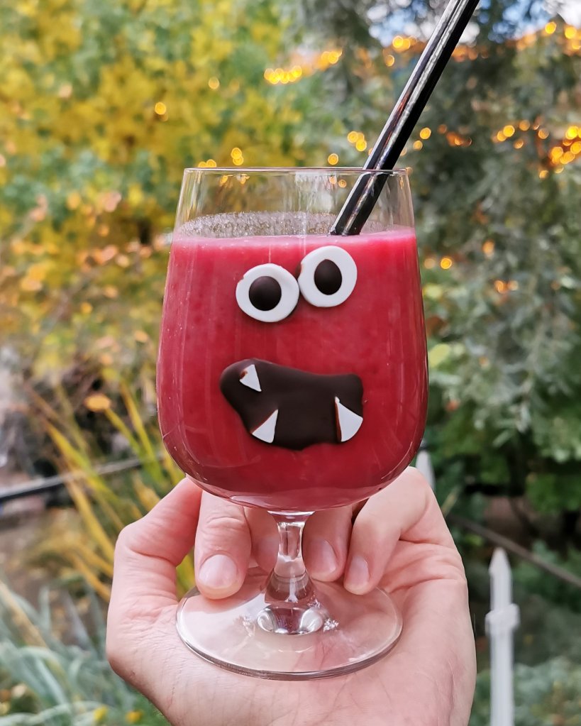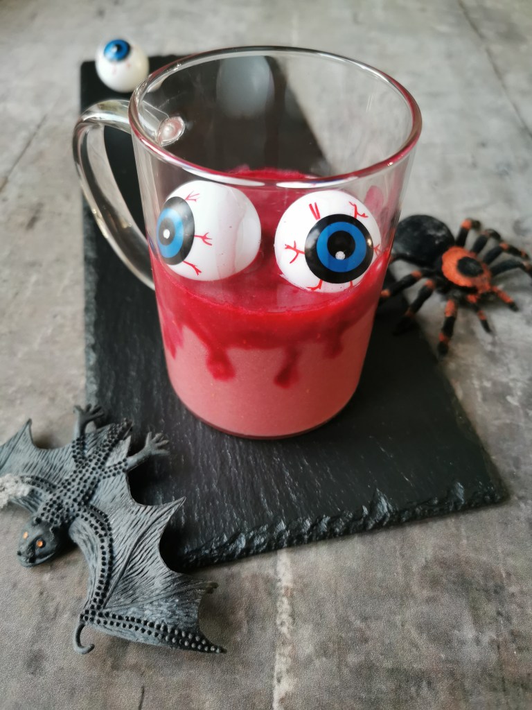 Fyld glassene med smoothie og kom lidt rødbedesaft på toppen som blod. Hvis du river rødbeden ned i en skål, så får du rigeligt saft. (Pas på! Du får blodige hænder, hvis du ikke bruger handsker. Så kan alle se, hvem der dræbte monsteret.) Det revne rødbede kan komme i en salat til aftensmaden, bages med i brød eller smides i en wokret. Brug en teske til forsigtigt at få rødbedeblodet til at dryppe ned i smoothien. Så er den færdig. Skynd dig at drikke dens blod, før den drikker dit. Muhahaha!