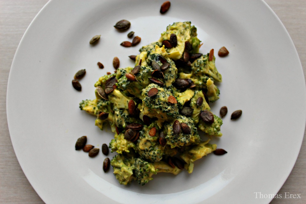Broccolien skæres i små buketter og blandes med mayonæsten-dressingen og evt. soltørrede tomater eller facon. Drys med ristede kerner og server broccolisalaten som tilbehør til fx deller.