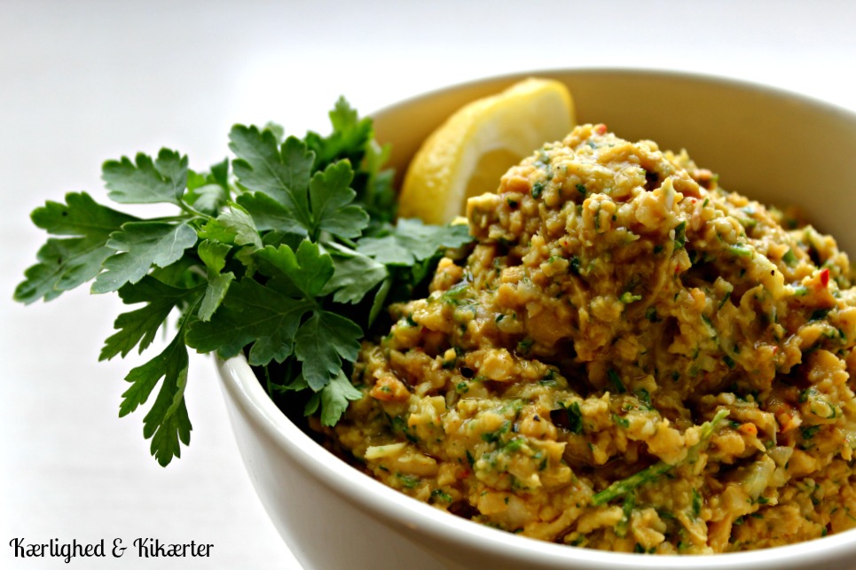 Blend det hele sammen, juster konsistensen med vand eller olie, og juster smagen med salt, peber og citronsaft.