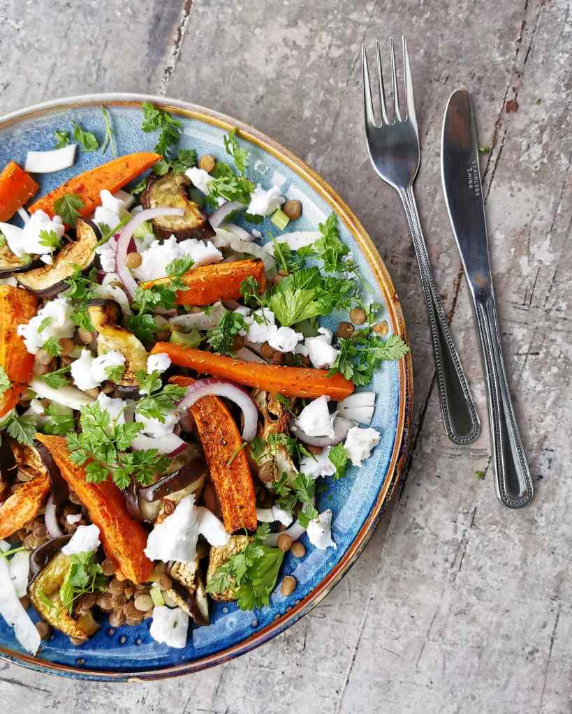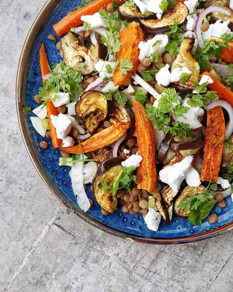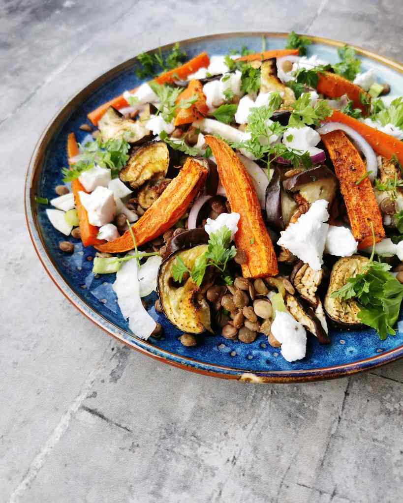 Lækker linsesalat med bagte rodfrugter og aubergine, frisk grønt og plantebaseret fetaost. Den her lune salat er tilfredsstillende og mættende. Perfekt til frokost og som tilbehør til aftensmaden.