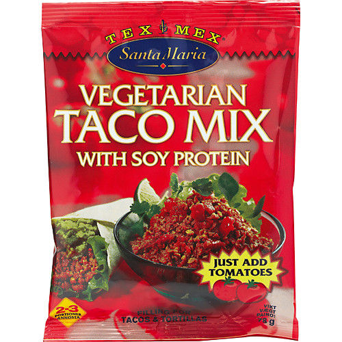 Denne taco-mix er let at finde i fx Føtex og andre større supermarkeder. Den indeholder sojakød, så den bare skal blandes med flåede tomater og vand, så er der kødsovs til pasta, tacos eller andet.