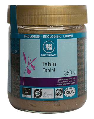 Tahin er sesampasta. Denne udgave er mørk og tyk. Jeg spiser den på rugbrød med agurkeskiver. Den kan købes i de fleste større butikker.