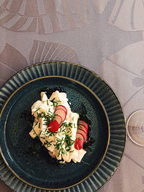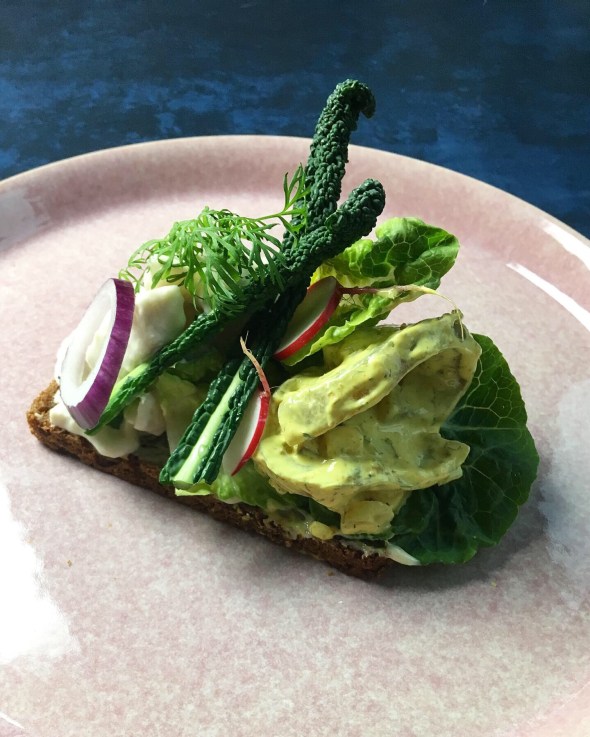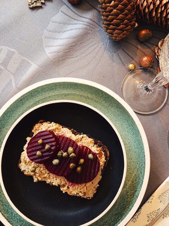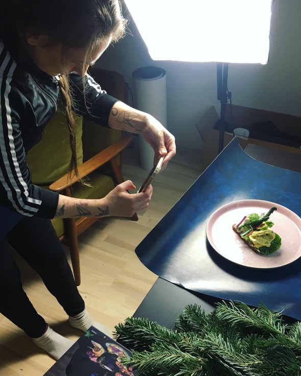 Jeg havde anrettet den første servering til hver af os, og så kunne gæsterne vælge plads efter, hvilken anretning, de helst ville spise. Herefter inviterede jeg dem til at anrette deres egne og tage billeder i mit lille fotostudie, hvor jeg har baggrunde, lys og masser af pynt. De er jo bloggere, så det gav sig selv, at de skulle have lov til at lege lidt med maden. Dagens fineste anretning var nok Neels. Hun er jo også kok og megadygtig! (Tjek hendes kogebog ud.) Neel anrettede to slags pålæg på én skive rugbrød.