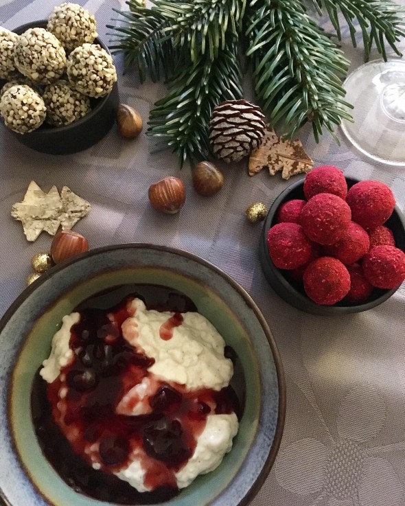 Efter en masse madder og snak serverede jeg de søde retter, og der var selvfølgelig mandel i risalamanden. Den fik Julia, og så vandt hun mandelgaven, som var en vegansk blåskimmelost. Og som Calina sagde, “det er kun veganere, der kan finde på at give en ost som mandelgave.” Det er der nok noget om. En vegansk ost af den slags er både dyr og kan ikke købes alle steder, så for os er det stadig et lidt specielt luksusprodukt. Desværre er mange af dem rigtig dårlige, men hos Madenitaly i København kan man købe nogle meget lækre!
