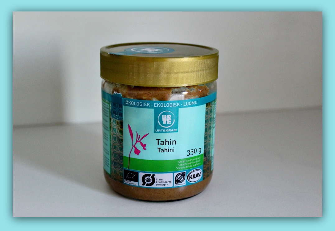 Sesampasta. Du kan få både en tyndtflydende, lys udgave og en mørk og tyktflydende udgave.