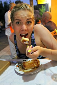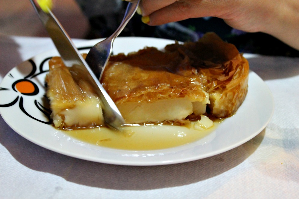 Sojamælketærten skulle der jo være plads til. Stelios forklarede, at fyldet i “tærten” var lavet af sojamælk kogt med majsstivelse, sukker og orangeblomstvand. Vi fik den serveret med en lækker frisklavet sirup til.