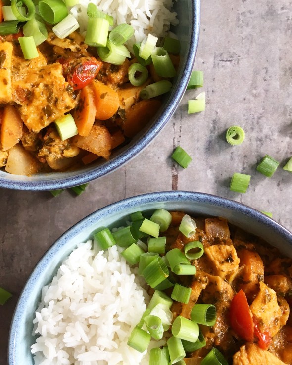 Denne karryret er vegansk (selvfølgelig), glutenfri og med de lækreste sojakylling-stykker fra Hälsans Kök. Det er ikke en betalt reklame, jeg vil bare gerne anbefale det bedste produkt. Du kan sagtens skifte sojakød-stykkerne ud med fx stykker af røget tofu (kan findes billigt og økologisk i Aldi) eller fx “pipfri” fra Naturli’.