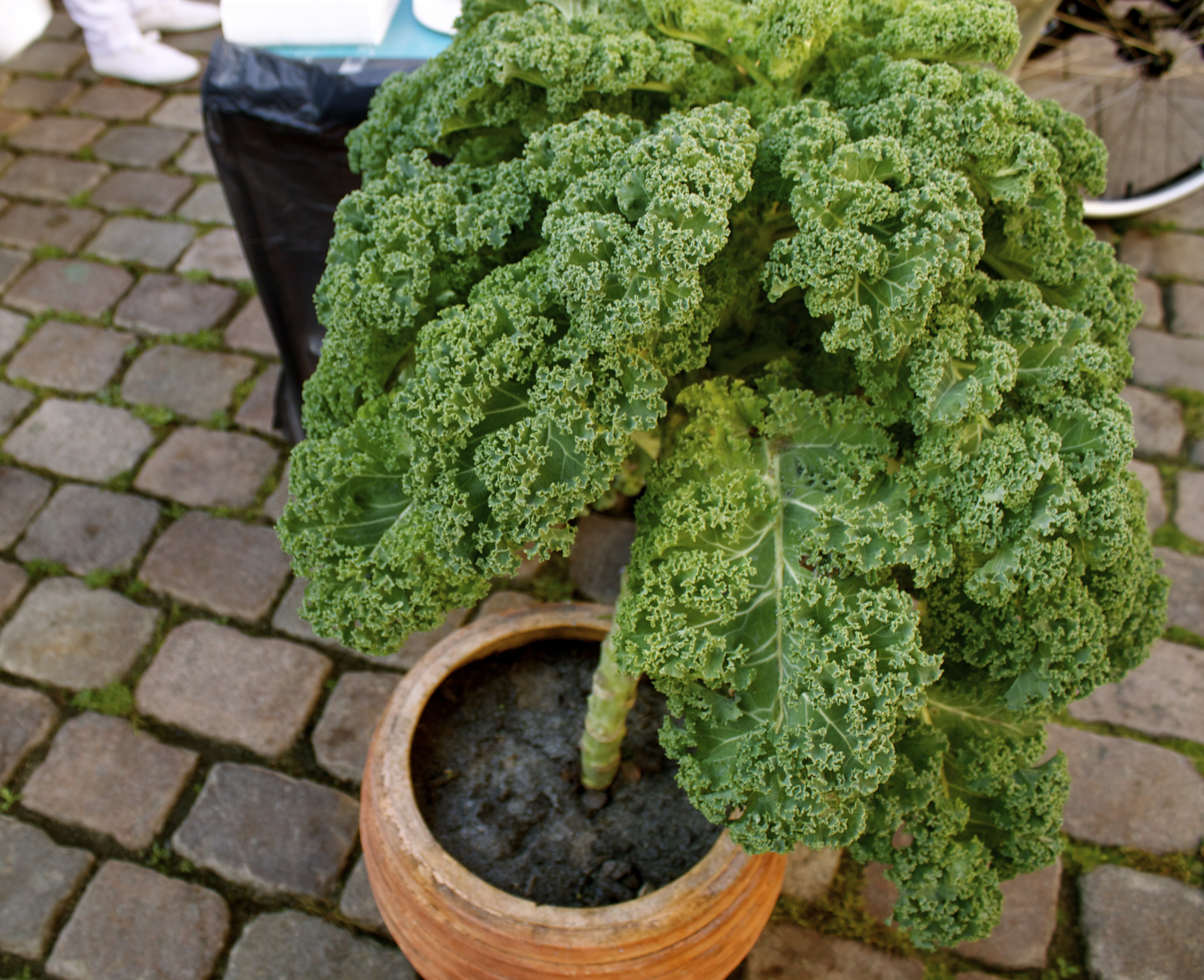 Op til jul bloggede du om 10 gaver til veganeren, og her fik jeg første gang idéen om grønkålsplanten. Jeg ringede straks til min mor, hun sagde at det var håbløst, at man skulle forspire og jeg måtte vente til næste efterår. Google kunne heller ikke hjælpe mig. Tilsyneladende var det håbløst at finde en grønkålsplante med rod! Opgivende tog jeg ned på Grønttorvet her i Aalborg, indstillet på bare at købe friske blade. Nysgerrig spurgte jeg den flinke mand, om det mon kunne være muligt at købe en plante med rod? Tre dage senere hentede jeg så min første grønkålsplante (10 kr, bum!), som jeg straks plantede ude i en af de tomme pallerammer hjemme i kollektivets have. Den har klaret det virkelig godt og jeg er så glad hver gang jeg henter et blad. Men når man bor ni mennesker sammen, rækker den ikke langt. Derfor har jeg i dag hentet og plantet fire mere.