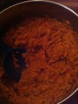 Sauter rødløg, hvidløg, ingefær og chili sammen med spidskommen i lidt olie i en gryde. Når løgene er klare, og der dufter godt af ingefær, hvidløg og spidskommen, så tilsæt gulerødder og peberfrugt, og lad det sautere med et par minutter, indtil det er mørt. Tilsæt så linserne og en liter af bouillonen (den må gerne koge – du kan fx tilsætte bouillonpulver/-terning og så kogt vand fra din el-kedel). Lad det koge til linserne er møre – det vil sige kogt ud (cirka 20 minutter) – og tilsæt mere vand undervejs, hvis det er nødvendigt. Når dahlen er kogt færdig smager du til med peber, mere spidskommen og evt. salt. Tag den så fra varmen, og rør tomatpuréen i. Smag til en sidste gang, og server så din dahl med fx (brune) ris eller, som på billedet, med kogte speltkerner. Drys med hakkede nødder for at få lidt knas. Fx ristede eller røgede mandler, cashewnødder eller pistacienødder.