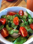 Når det nu endelig skal være salat, så lad det være salat med lidt gods i. Iceberg, agurk og tomat er simpelthen for kedeligt. Den her salat er meget enkel, men samtidig gør kartoflerne og dressingen, at den både mætter og er lækker. Du kan lave kartoflerne og dressingen til hvilken som helst salat, men her består den af salatblade, tomat, ærter, peberfrugt og græskarkerner. Her er kartofler og dressing til en frokostanretning til 2-3 personer.
